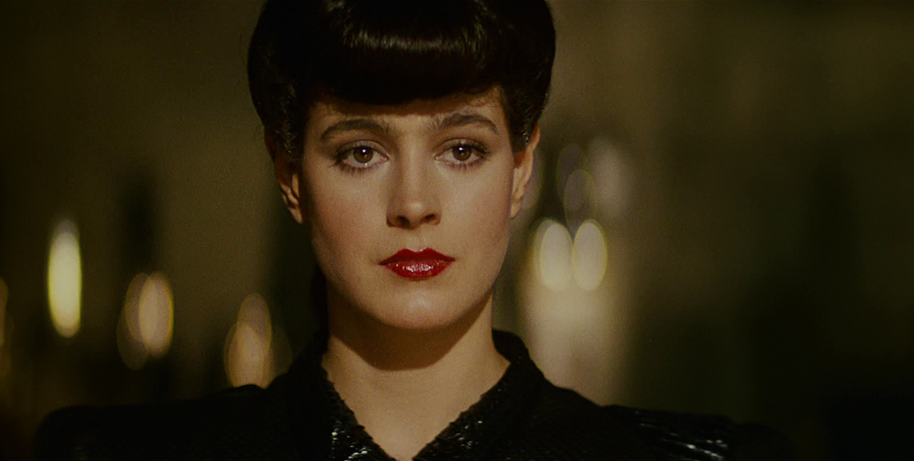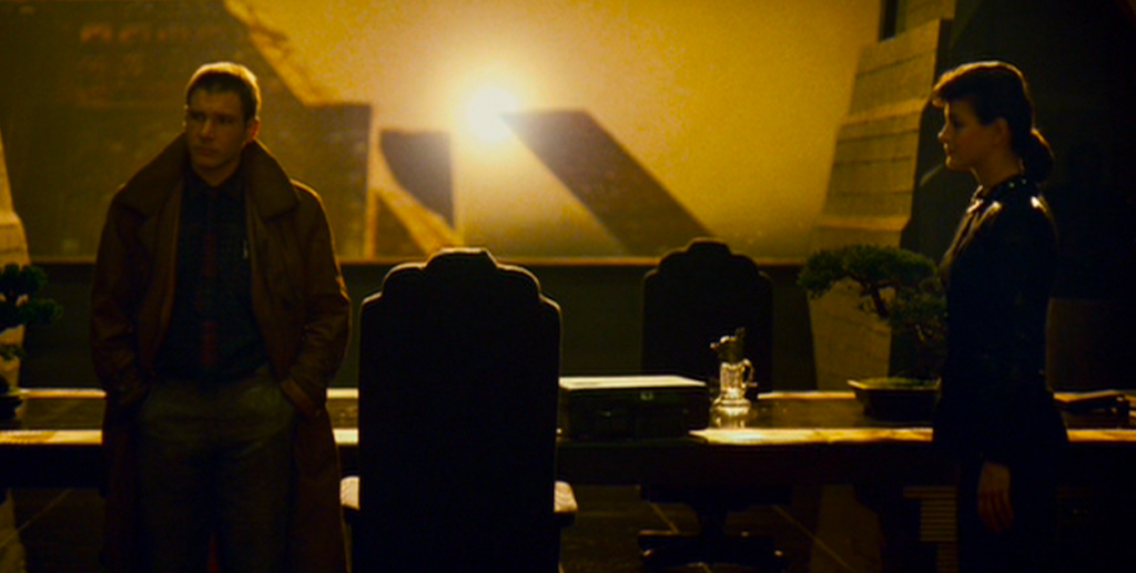 The scene introducing Rachael treats the audience to a captivating skyline bathed in a rare, golden sun, a synthetic owl threshing before Rachael as a symbolic forerunner (the symbol for wisdom and for Lilith, Adam’s first wife). Then, her stilettos clopping out of the darkness and into the lobby, a ravishing woman glides into frontal view with stylistic poise, a one-of-a-kind modern coiffure, treating viewers with an iconic scene for not only the film itself but for cyberpunk at large. This timeless lobby scene is built entirely around Rachael, featuring her demure and vestal charm. In all, Ridley Scott crafted the scene for a potent sense of encounter. Now while Deckard is a stolid man by nature and probably holds his cards close, Gaff later betrays his interest with a priapic origami figurine cluing us in that the detective is hopelessly smitten.